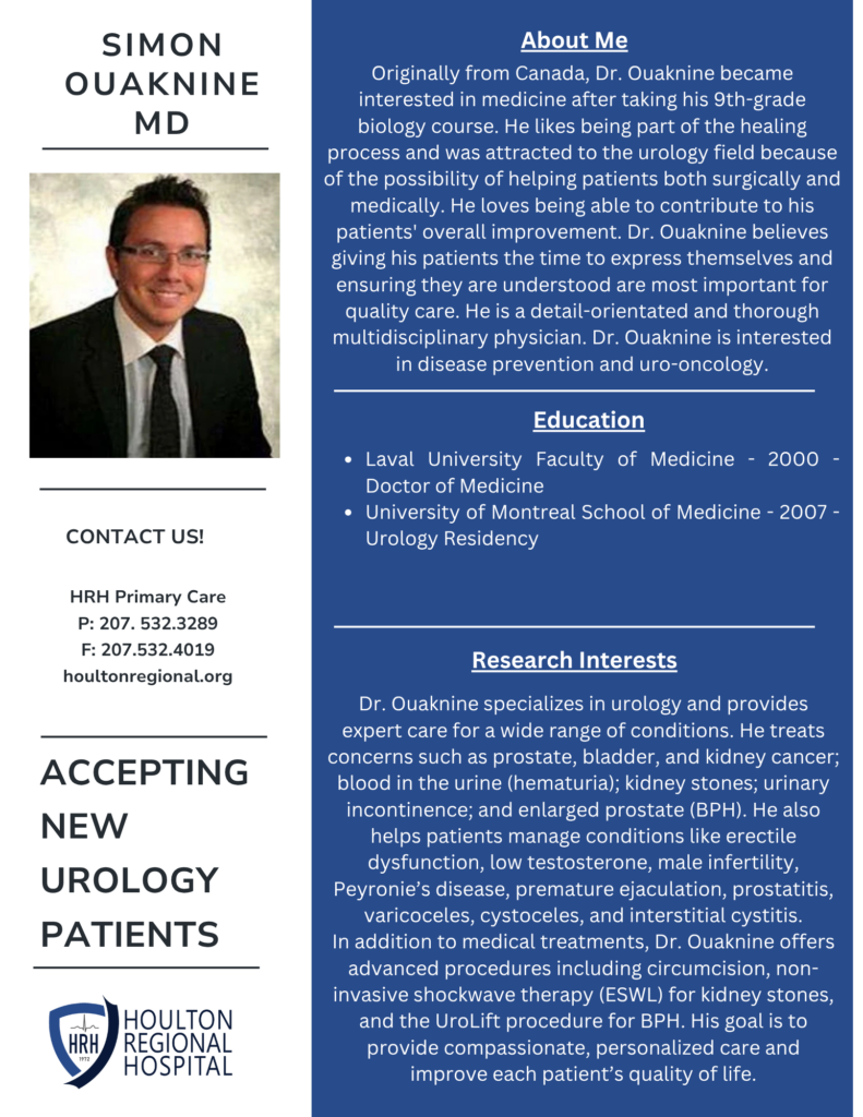We’re excited to welcome Dr. Simon Ouaknine to Houlton Regional Hospital, where he will be providing Urology services right here in our community!