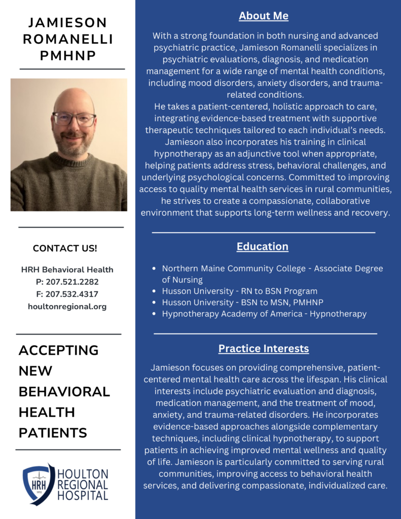 Welcome Jamieson Romanelli, PMHNP, to our Behavioral Health Department